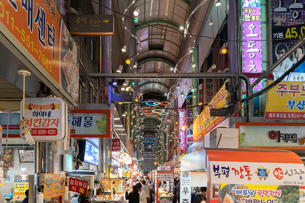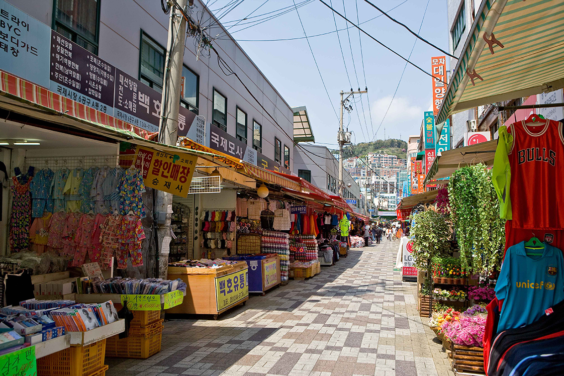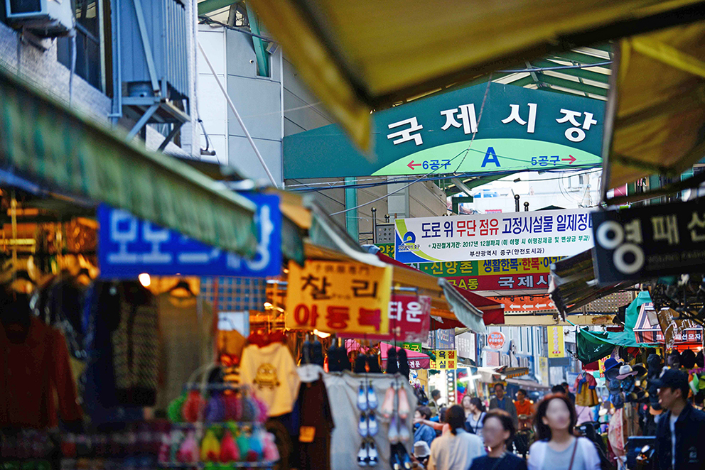 광복 후 일본인들이 남긴 물건들이 거래되면서 시장이 형성되어 ‘도떼기 시장’으로 불렸다. 1948년 자유시장으로 명칭되다 6·25전쟁 발발과 함께 미군 원조물자 및 군용물자, 일명 ‘미제 물건’이 거래되면서 ‘국제시장’이라는 이름이 자리잡았다. 영화 <국제시장>으로 더 알려졌으며, 씨앗호떡, 비빔당면, 떡볶이 등 다양한 길거리 음식과 가성비 좋은 물건들이 가득하다.