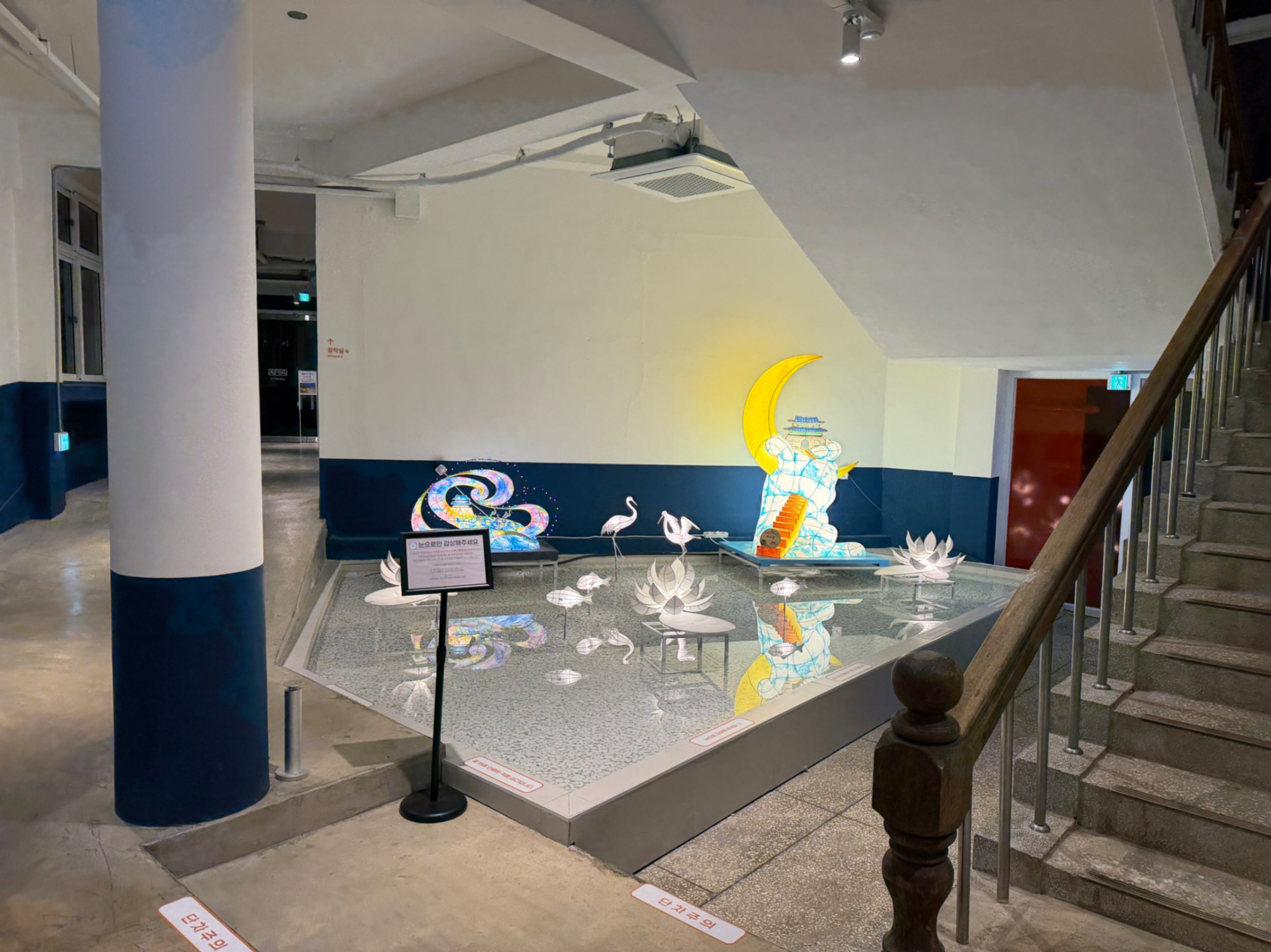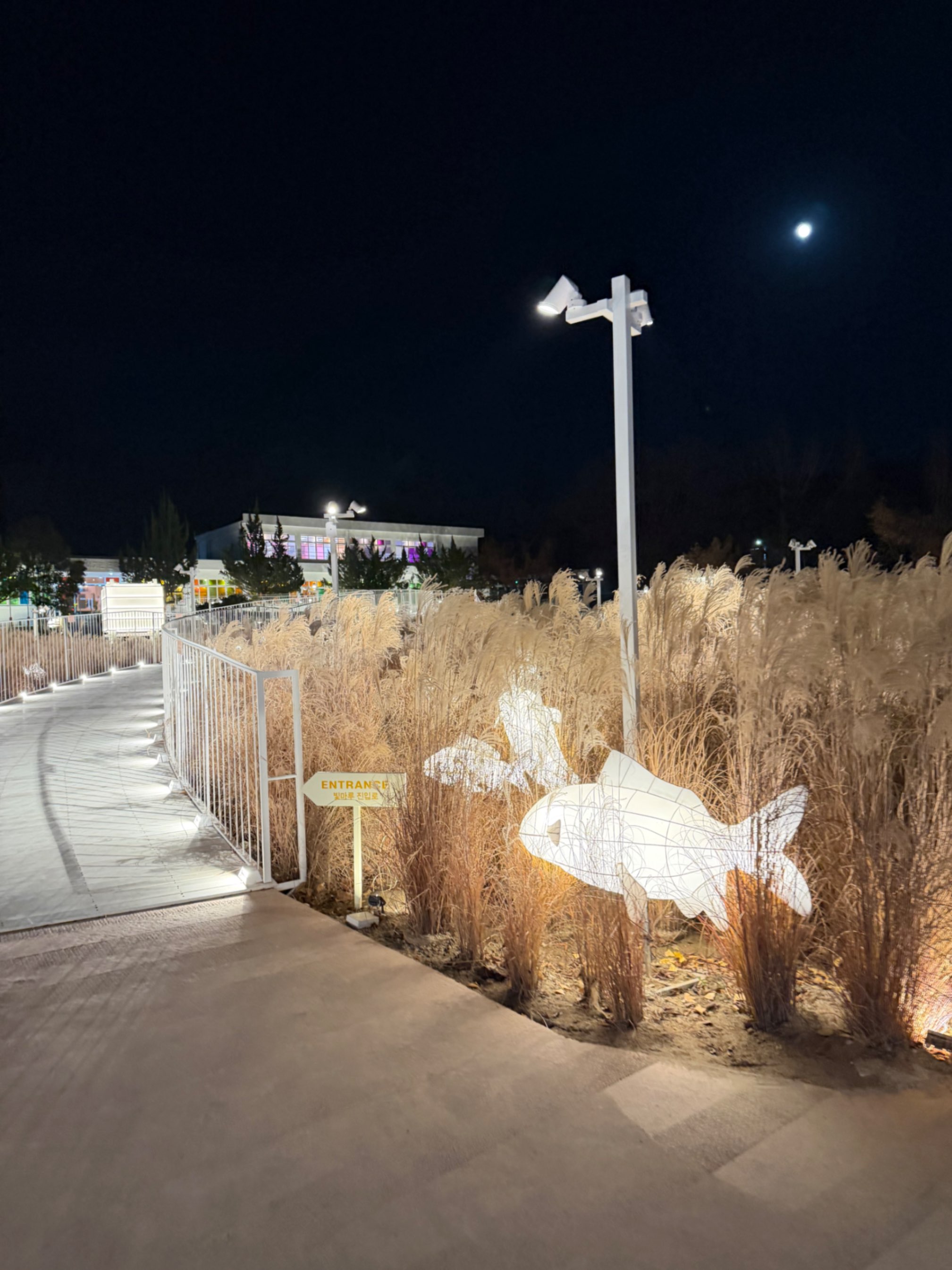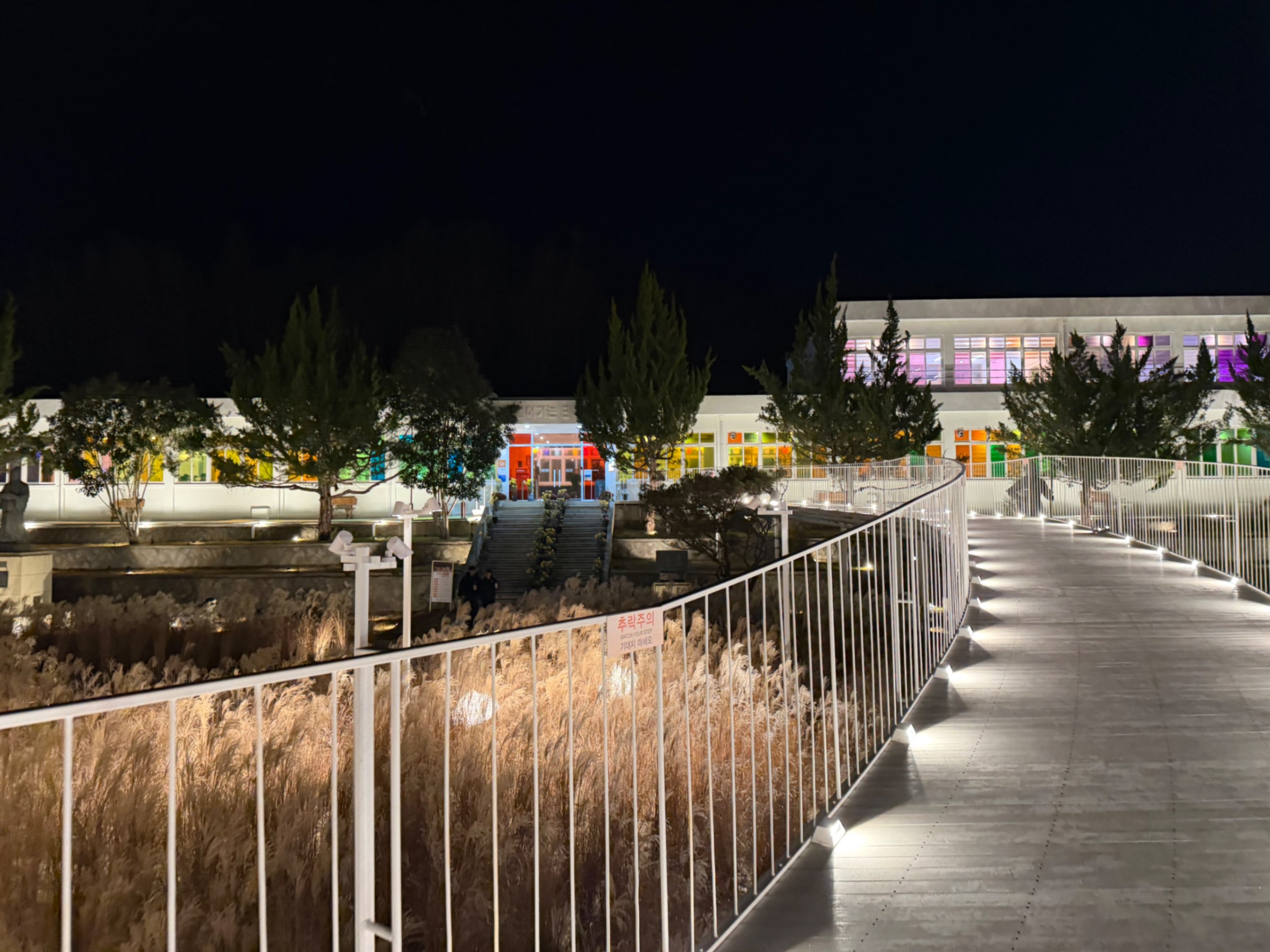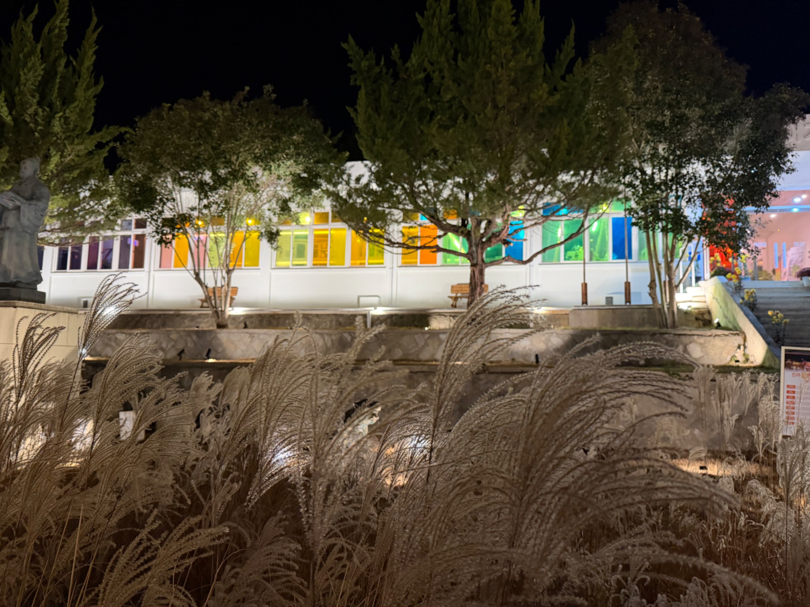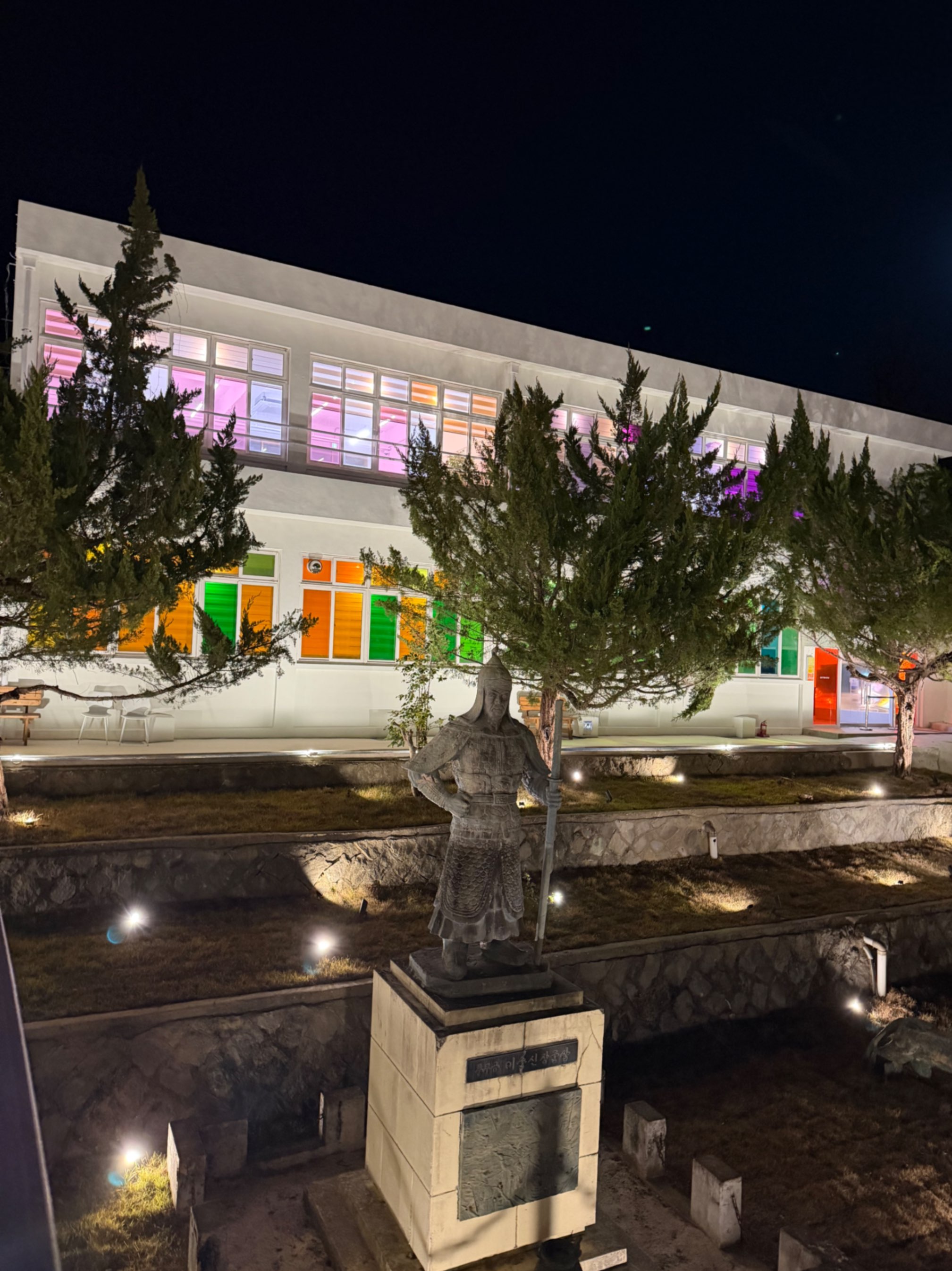 낡은 운동장 옆에 현대적인 색의 조명이 비쳐서 묘한 풍경을 만들고 있었다. 학교였던 공간에 요즘 감성의 색들이 덧입혀진 모습이 처음엔 조금 낯설었다. 이순신 동상은 그대로인데, 그 주변의 분위기만 completely 달라진 느낌이었다.