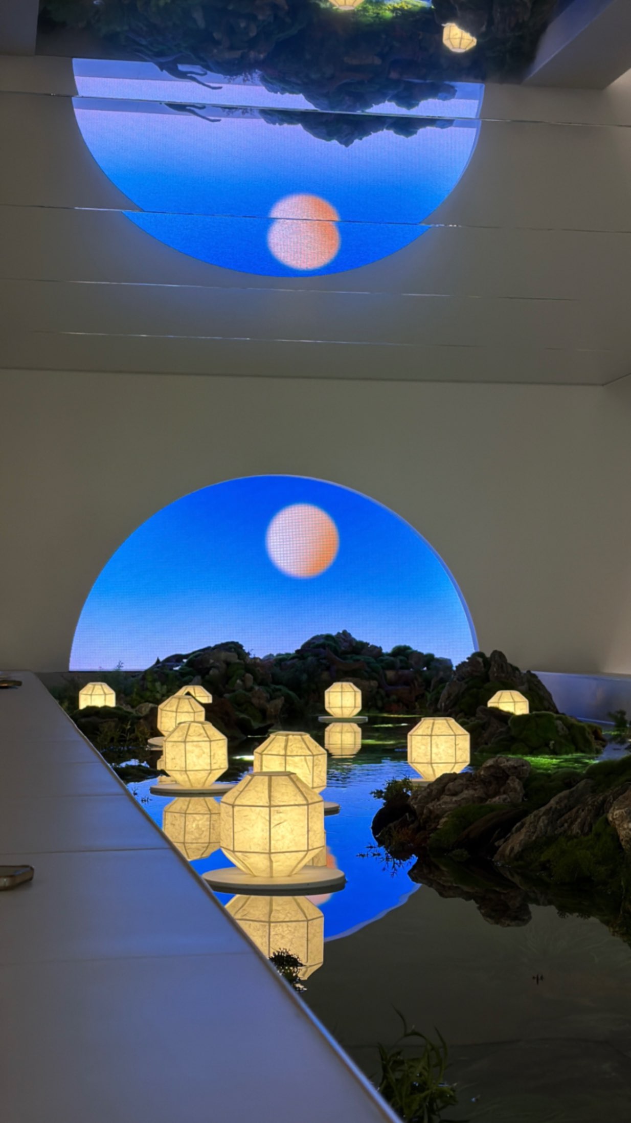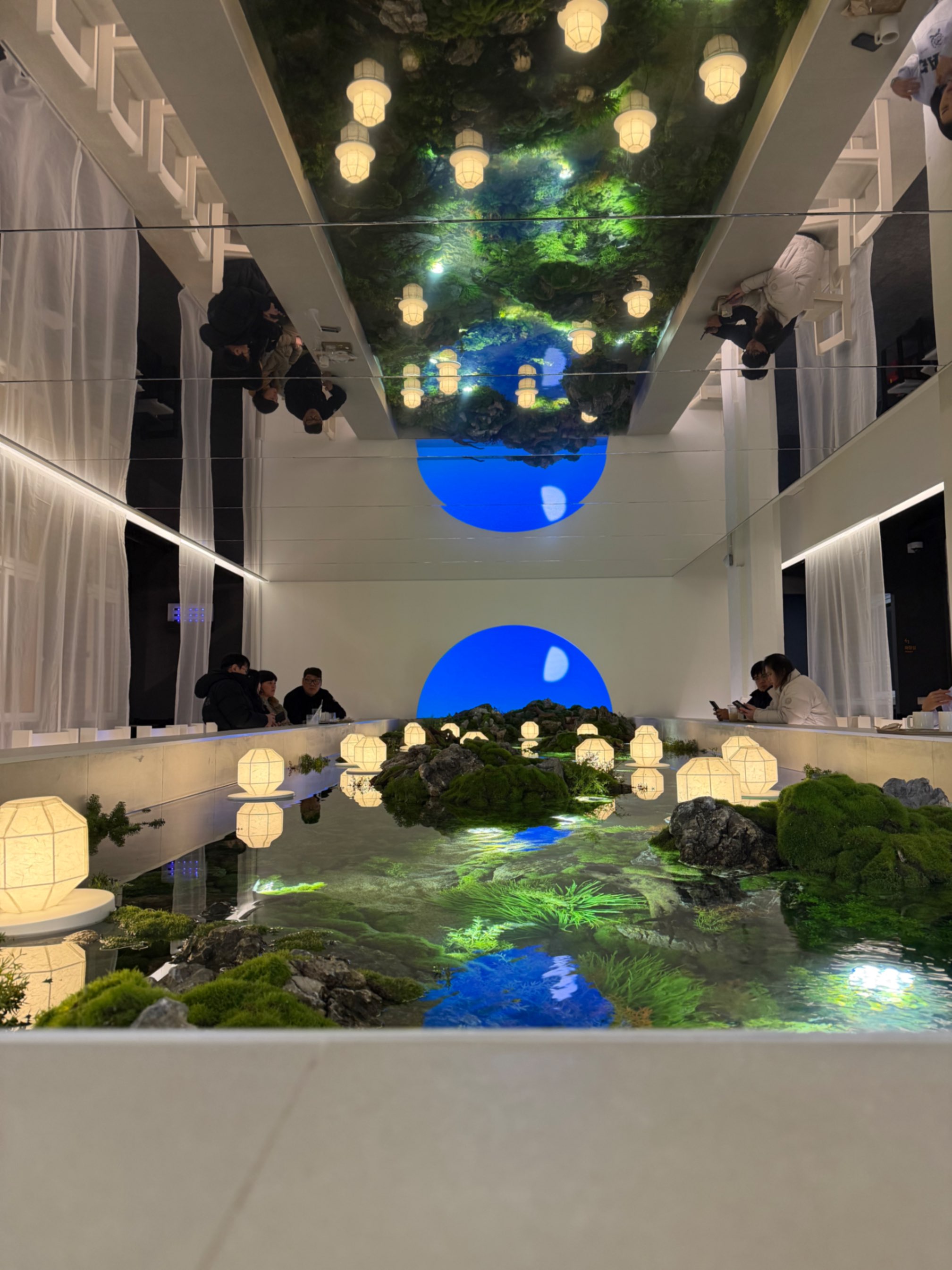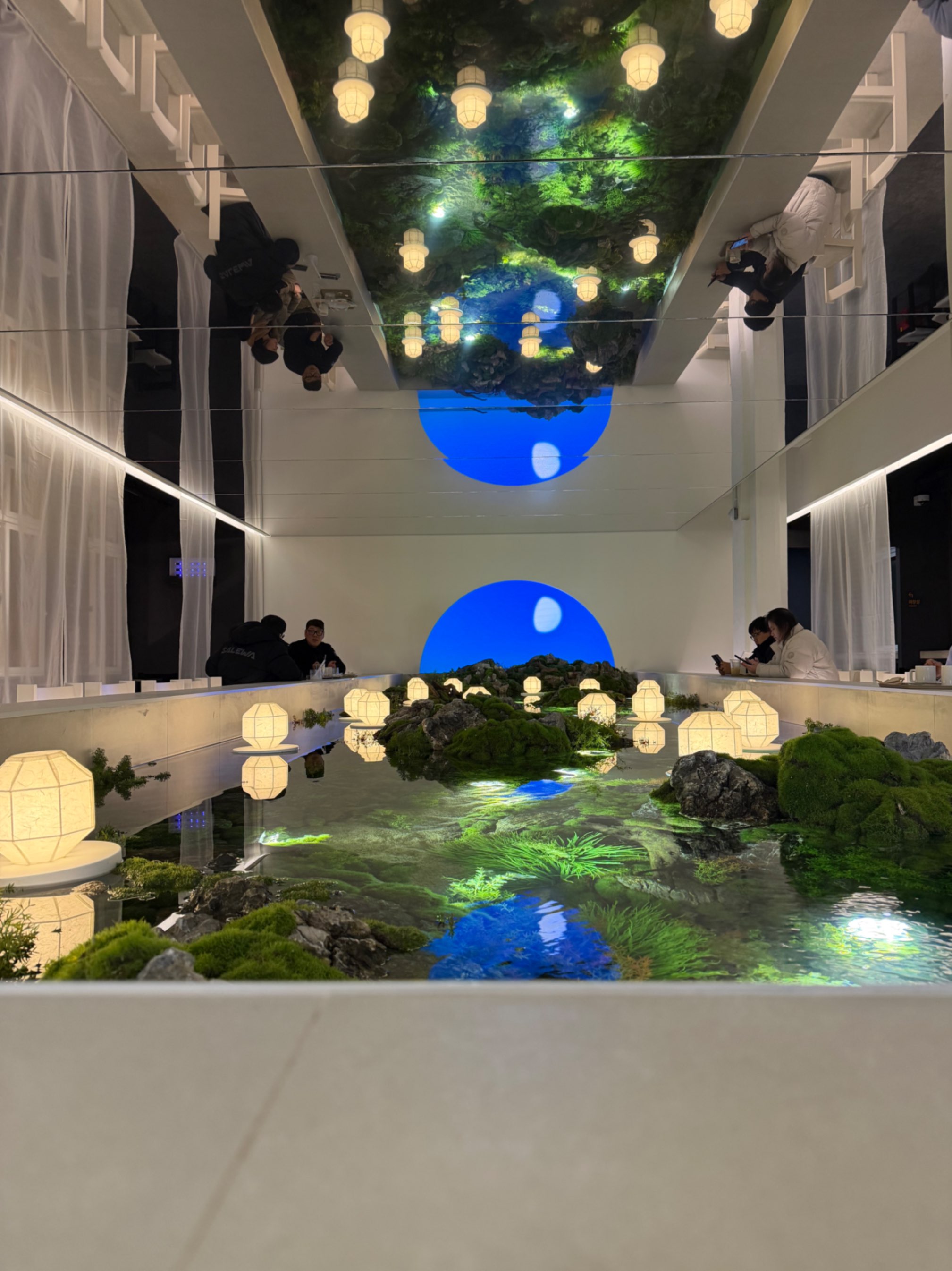 카페 내부 한쪽에는 일출과 일몰을 표현한 디지털 조형물도 설치되어 있다. 시간에 따라 색과 밝기가 바뀌면서 해가 떠오르고 지는 장면이 은은하게 반복된다. 강한 화면이 아니라 공간 분위기를 해치지 않을 정도로 조용히 빛이 흐른다. 폐교라는 장소에 디지털 요소가 들어가 조금은 낯설지만, 의외로 공간과 잘 어울린다. 낮과 밤, 시간의 흐름을 이 작은 조형물 하나로 보여주는 장치처럼 느껴졌다.