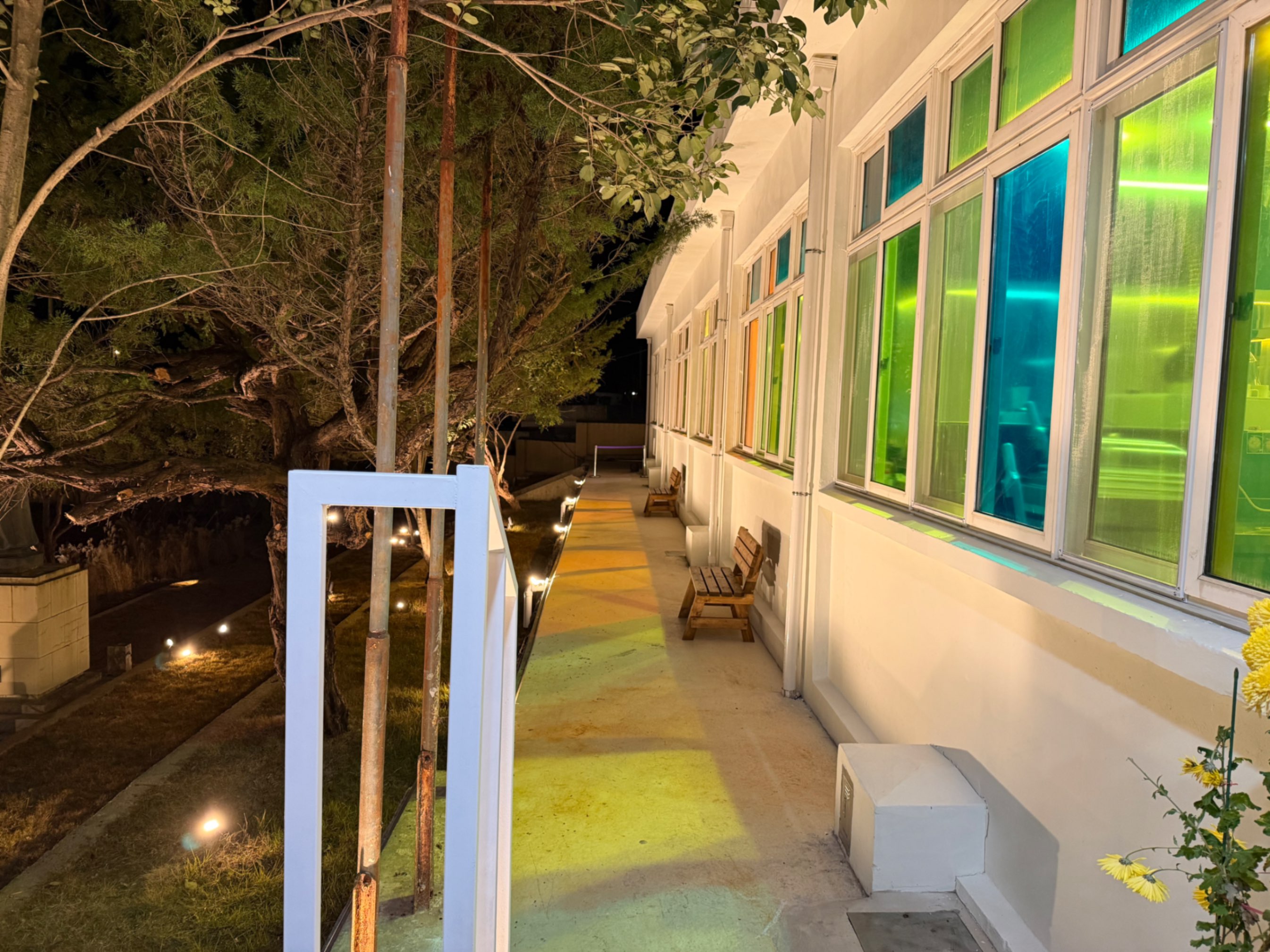 해가 완전히 내려앉은 뒤에 찾은 빛마루는 낮과는 또 다른 얼굴을 하고 있었다. 주변은 이미 어둠 속으로 잠겨 있는데, 폐교였던 건물 안쪽으로만 조명이 조용히 켜져 있어 마치 시간이 따로 흐르는 공간처럼 보였다. 멀리서부터 새어 나오는 은은한 불빛이 길을 안내하듯 이어지고, 그 불빛을 따라 들어서는 순간 바깥의 소음은 자연스럽게 끊어진다